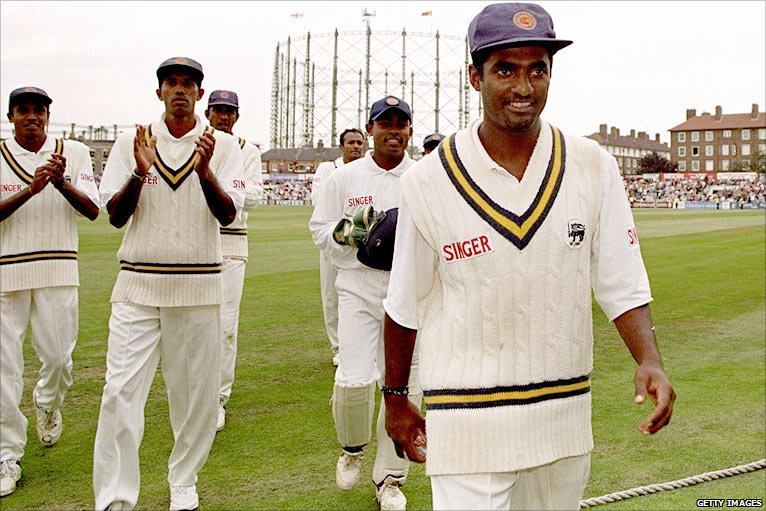 Muttiah Muralitharan is cheered on by his team-mates after he returned match-winning figures of 16/220 in the 1998 Oval Test (source – getty images and bbc.co.uk)