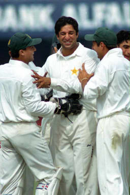 Wasim Akram is congratulated by his team-mates after he took the first of his two hat-tricks against Sri Lanka in the Asian Test Championship in 1998-99 (source – flickr.com)