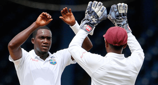 West Indian fast bowler Jerome Taylor celebrates a wicket with his captain Denesh Ramdin during the second Test against New Zealand at Kingston (source – antiguaobserver.com)