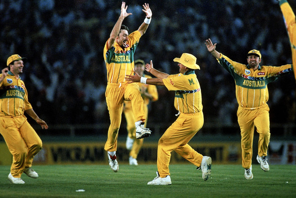 Damien Fleming celebrates with his teammates after dismissing last man Courtney Walsh in the 1996 semifinal at Mohali (source – zimbio.com)